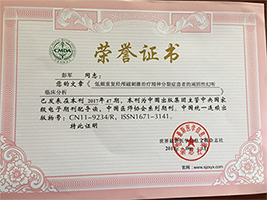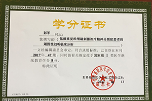 经过激烈而严格的筛选,我院医生彭军主任撰写的医学论文《低频重复经颅磁刺激治疗精神分裂患者的顽固性幻听临床分析》经《世界新医学》期刊编辑委员会审定,刊登在期刊2017年47期,同时按照有关规定授予彭主任国家级I类医学继续教育学分8分并颁发证书。